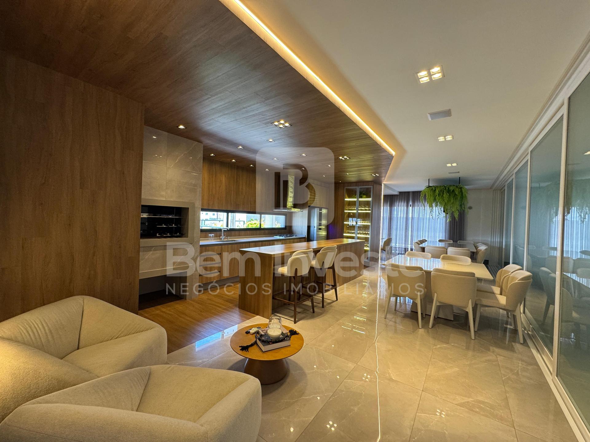 Living integrado com sala de estar, sala de jantar e cozinha gourmet planejada
